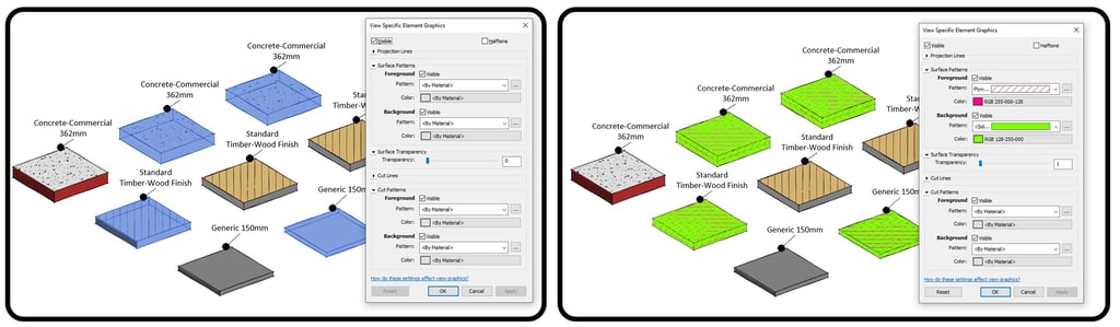 For instance, in the image below, if we select the wooden floor and change the pattern of the finish layer, the pattern of all floors with that same Type will be changed.