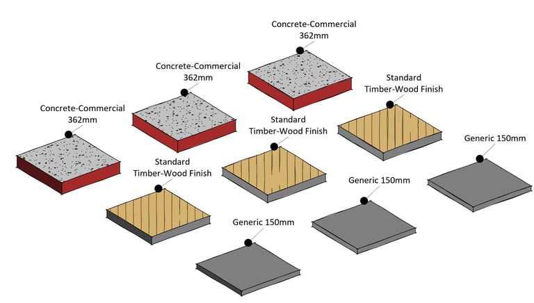 There are 3 different types of floors within this category: Concrete, Timber Wood, and Generic 15cm.